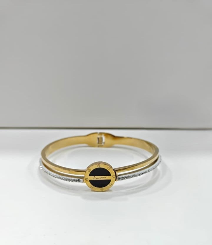 Elegant Gold-Plated Designer Kada Bracelet with Black Enamel and Stone Detailing for Women