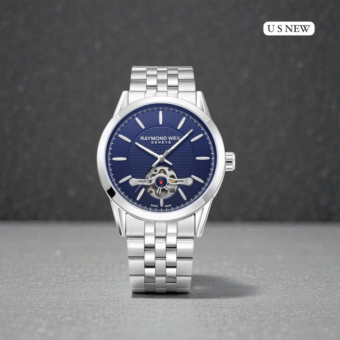 Premium Silver Stainless Steel Men’s Watch with Blue Dial – Open Heart Design