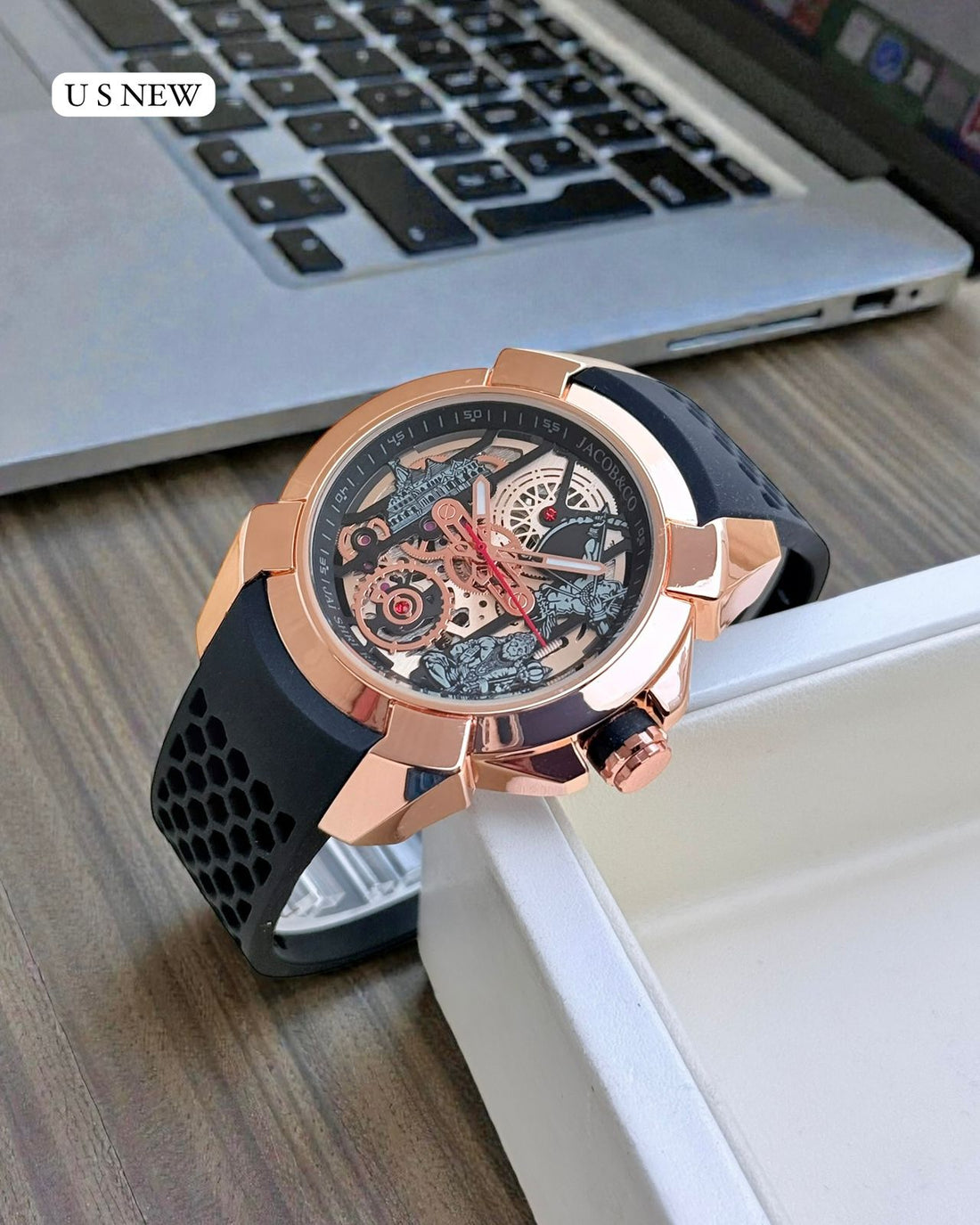 Men’s Luxury Skeleton Dial Watch | Rose Gold Case with Black Silicone Strap | Designer Sports Analog Watch