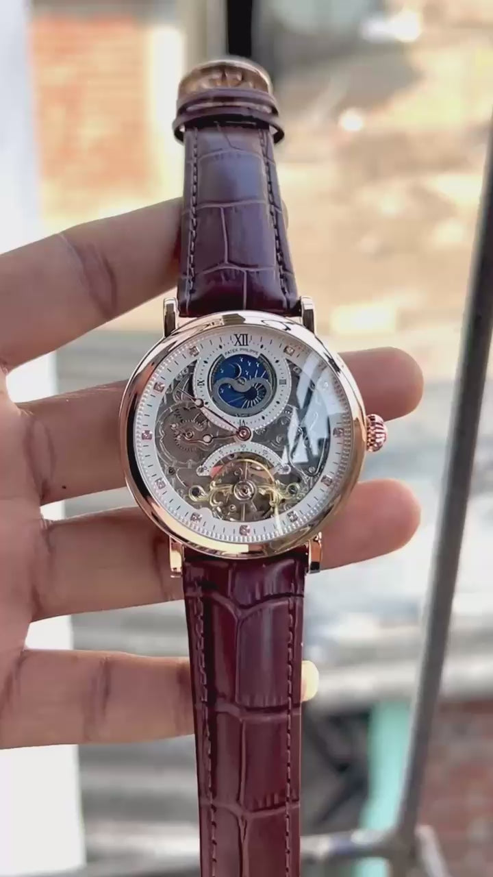Men’s Luxury Automatic Skeleton Watch | Moonphase Dial | Brown Leather Strap | Mechanical Wrist Watch