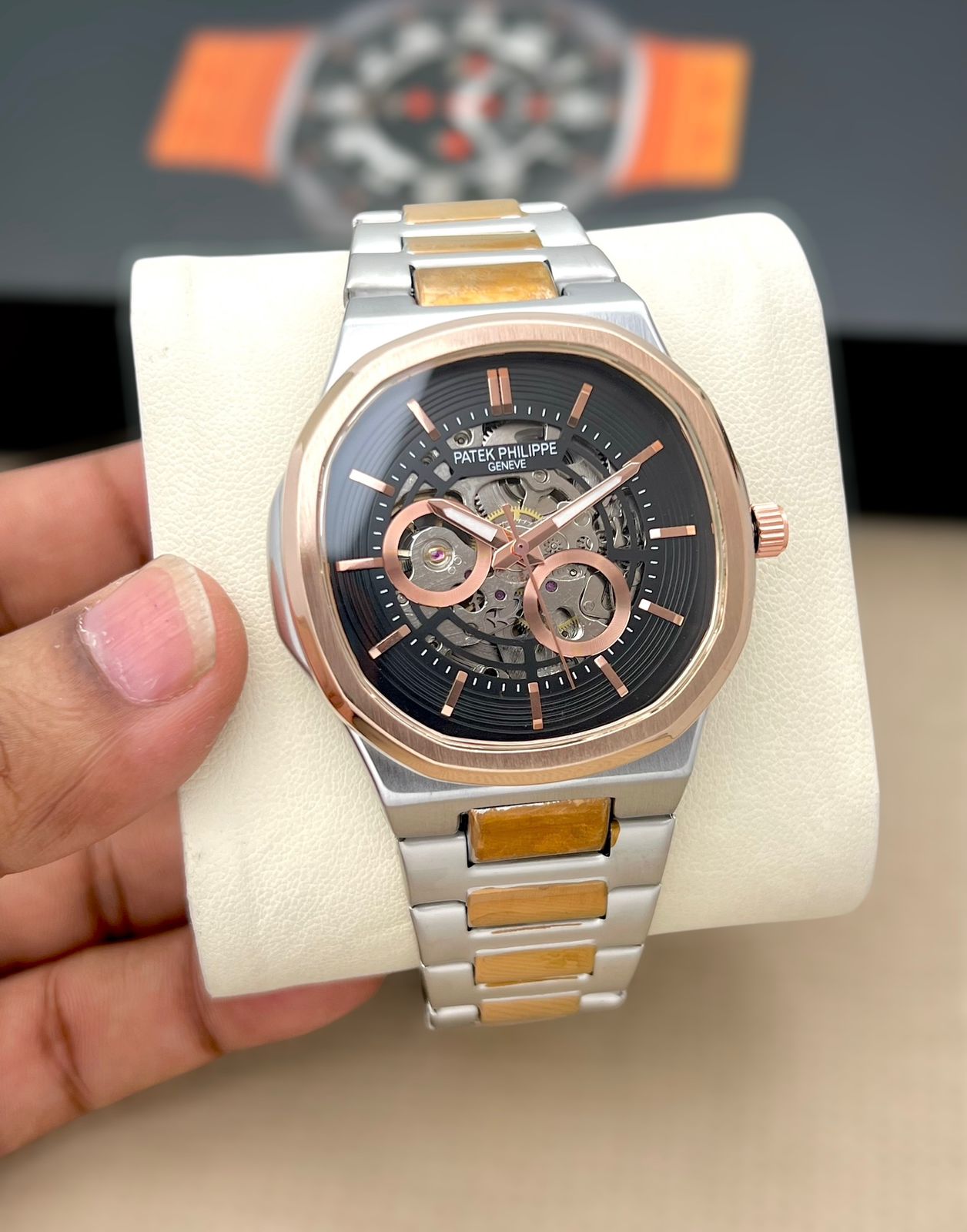 Men’s Luxury Skeleton Dial Analog Watch | Rose Gold & Silver Finish | Stainless Steel Strap | Designer Inspired