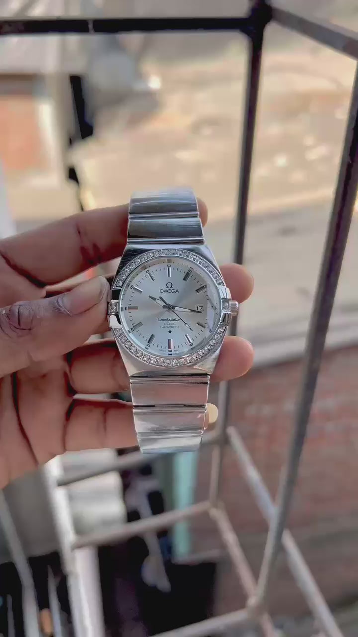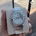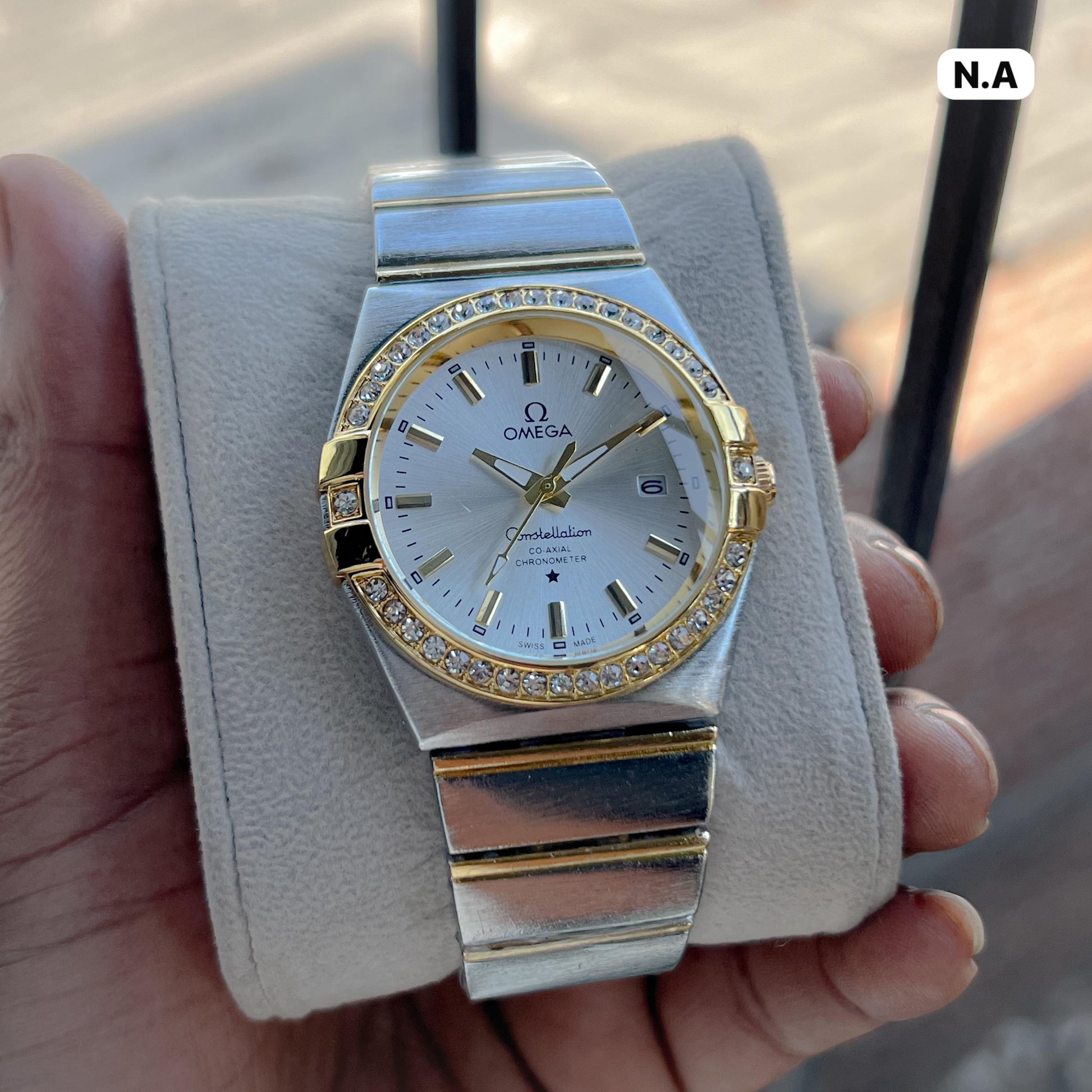 Men’s Omega Constellation Style Analog Watch | Silver & Gold Finish | Crystal Bezel | Stainless Steel Strap