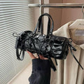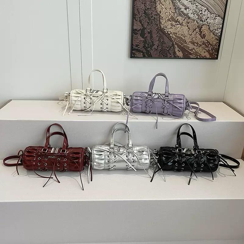 Premium Black Glossy Leather Lace-Up Barrel Handbag | Trendy Cylinder Shape Sling Bag