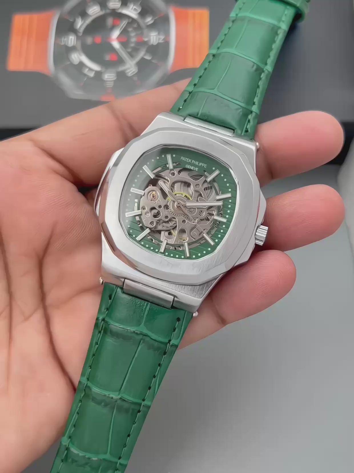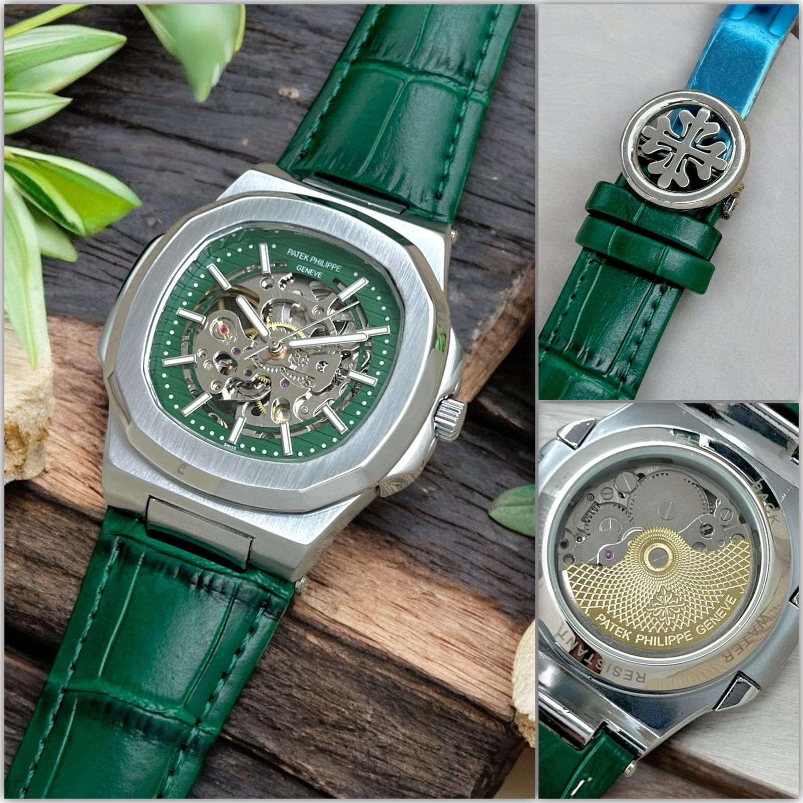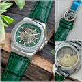 Premium Skeleton Dial Automatic Watch for Men | Green Leather Strap | Transparent Mechanical Movement