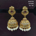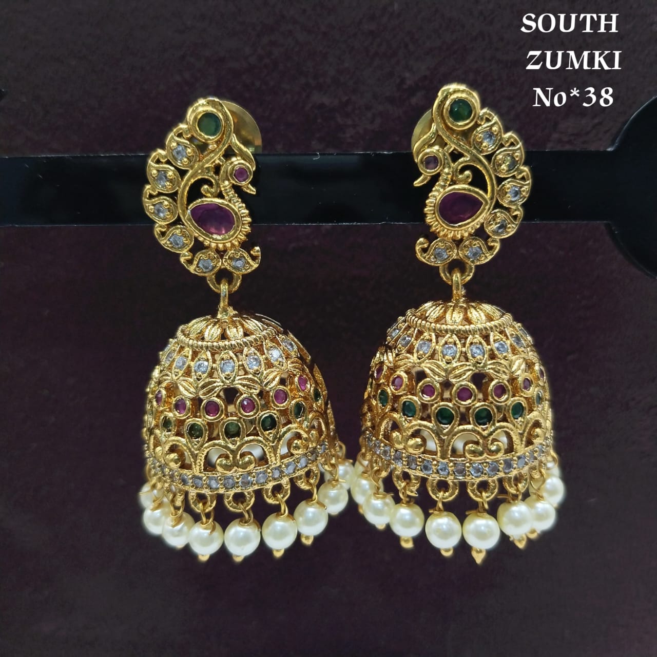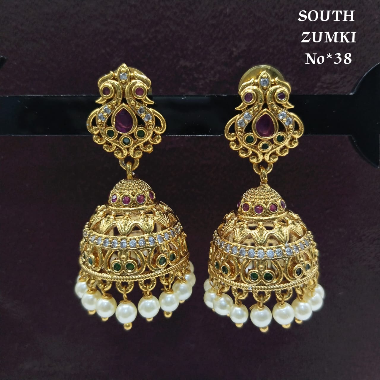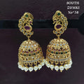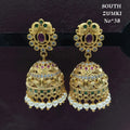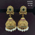 South Indian Traditional Gold-Plated Temple Zumki Jhumka Earrings | Ruby–Green Stones & Pearl Drops | No. 38