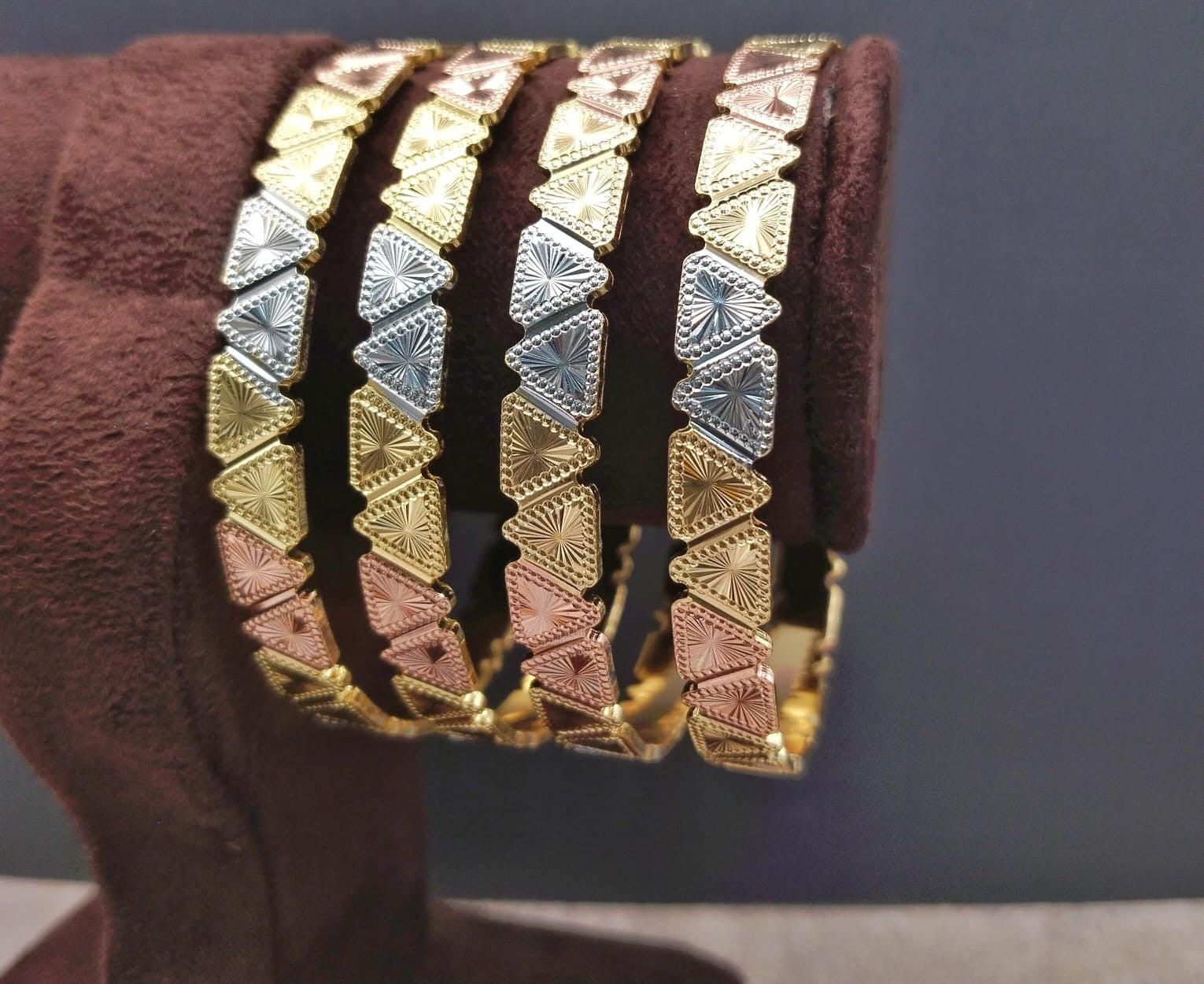 Stylish Tri-Color Triangle Pattern Artificial Bangle Set for Women – Gold, Rose & Silver Finish (Set of 4)