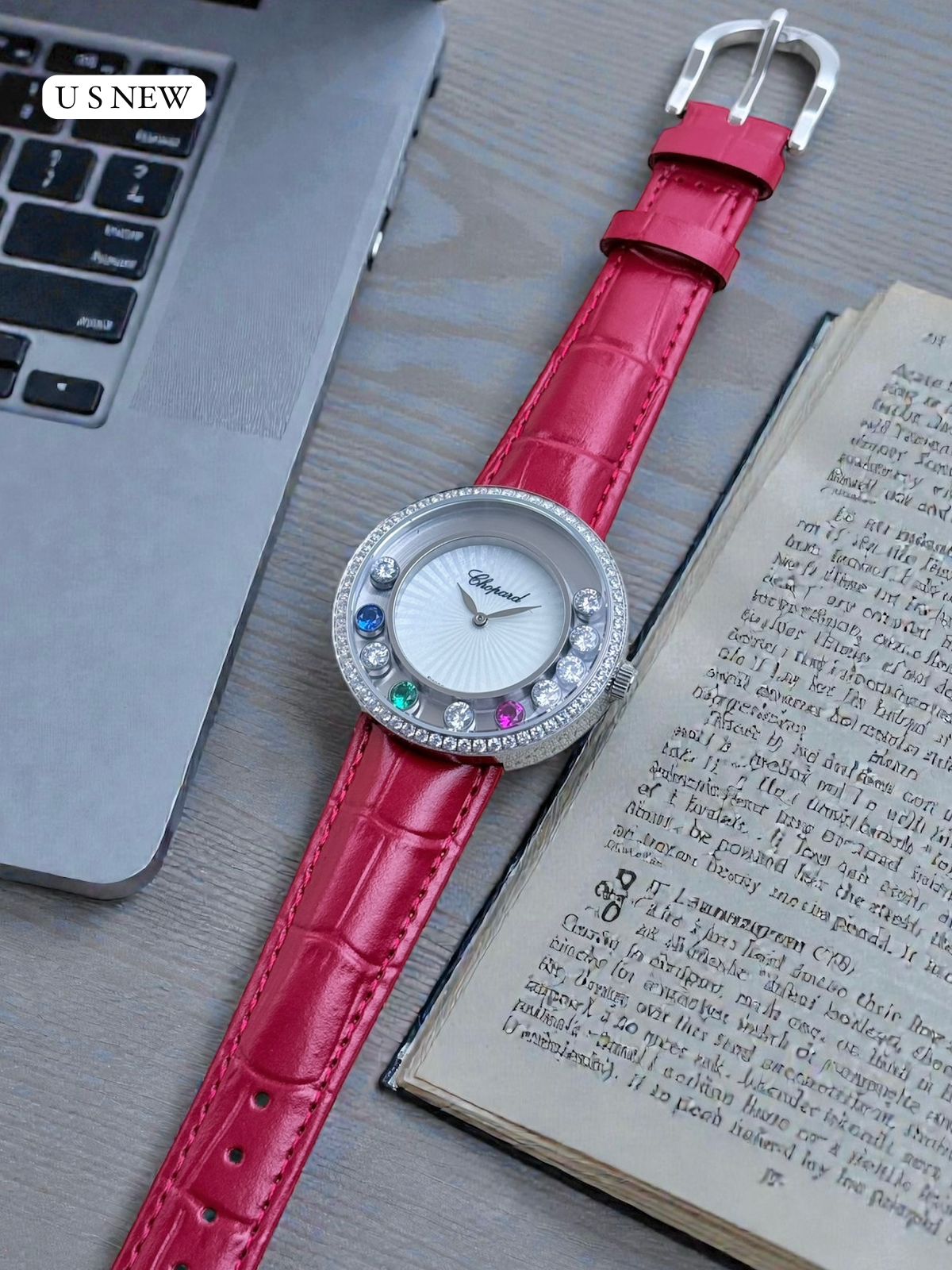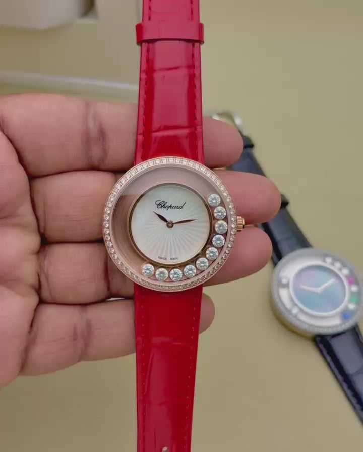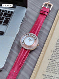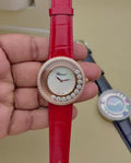 Women Luxury Analog Watch | Chopard Style | Crystal Bezel Dial | Red Leather Strap | Party Wear Watch