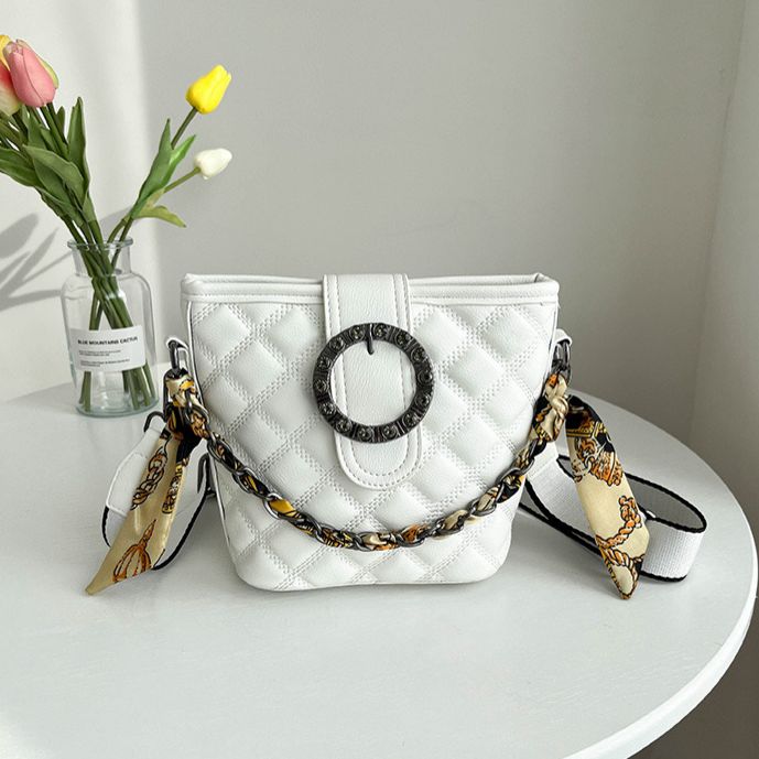 Women’s Quilted PU Leather Shoulder Bag | Elegant Chain Strap Crossbody Purse | Stylish Luxury Handbag with Scarf Detail – White